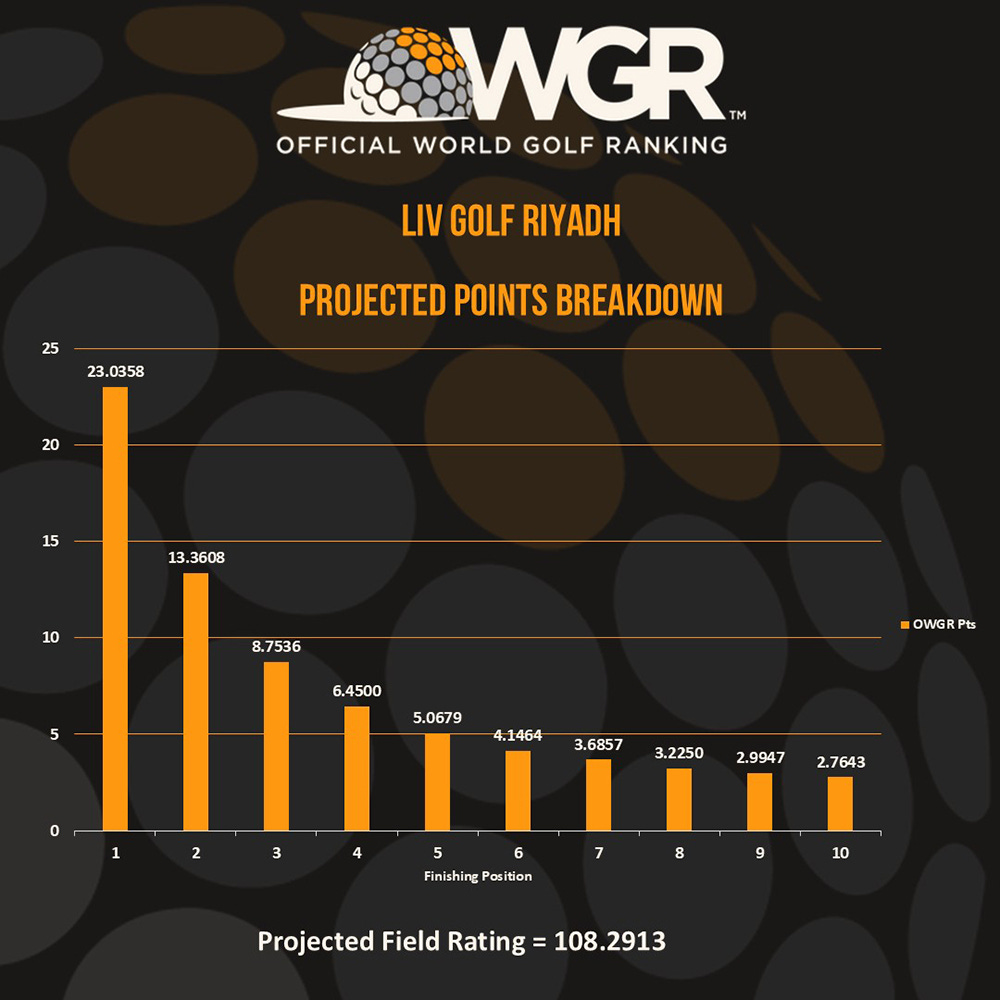 The OWGR mathematics are complicated, but the winner of this week’s event in Riyadh will get roughly 23 world ranking points compared to just more than 59 for the PGA Tour’s WM Phoenix Open winner and nearly 21 for the winner of the Qatar Masters on the DP World Tour. That’s based on LIV’s adjusted field rating of 108.29129 compared to the PGA’s Tour’s 344.55263 and the DPWT’s 121.74787. Since the OWGR is not reallocating all of those 108 points to the top 10, only about 68 percent of the points (73.48, or more with ties for 10th place) are being awarded to the top-10 finishers. The distribution to the top 10 is roughly in line with Data Golf’s points distributions from 2025.