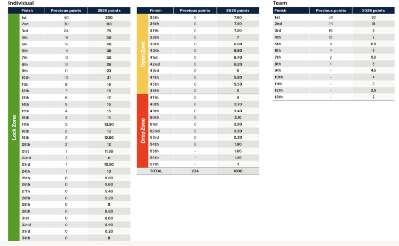 There will be more points available to each individual player, especially winners and podium finishers of LIV events. Individual winners will earn 200 points, up from 40 in past seasons. Second place will get 113 (up from 30) and third place 75 (up from 24). Instead of only giving points to top24 finishers, the point table be go all the way to 57th place (1 point) in 2026.