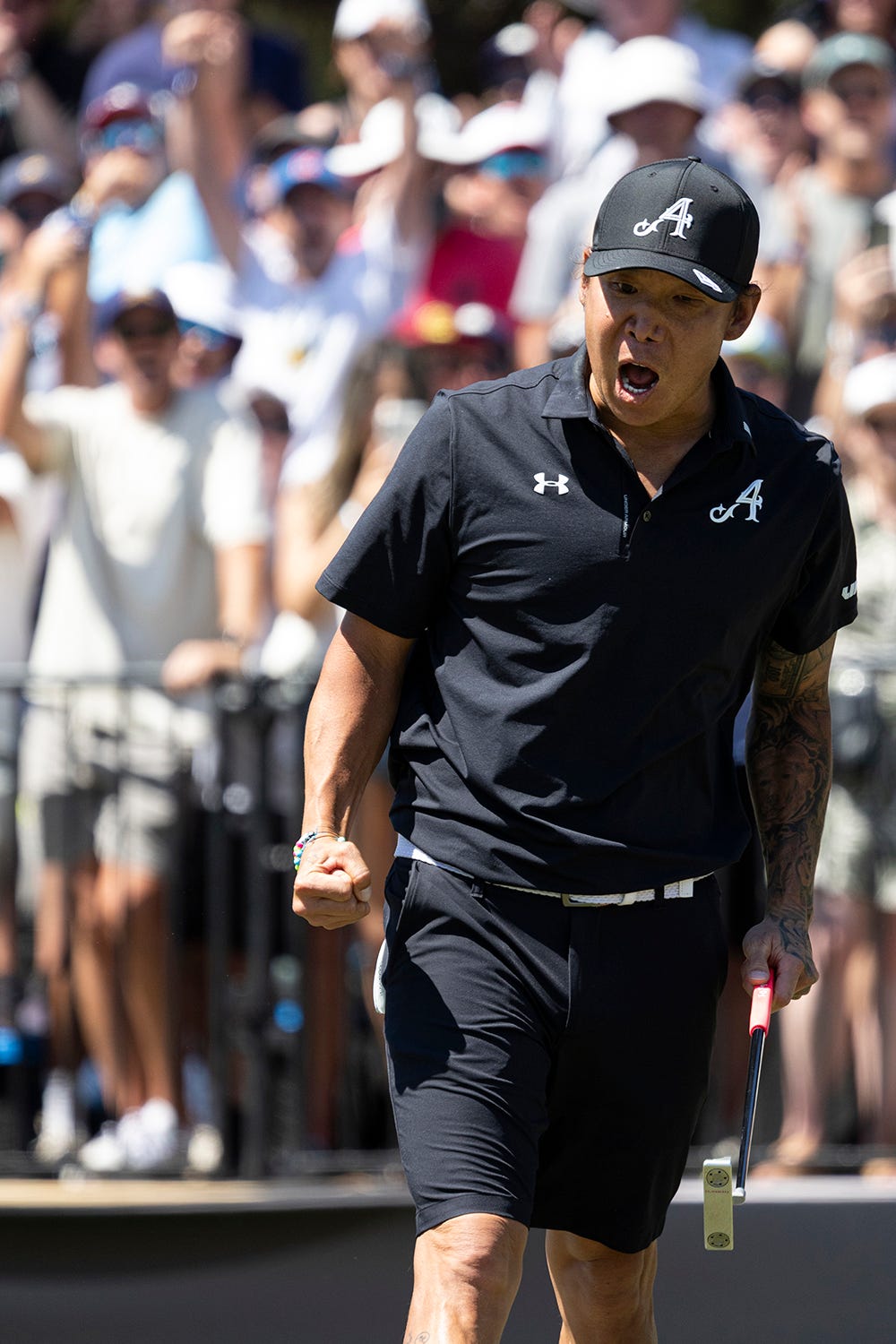 Kim roared when he grabbed a share of the lead on the Watering Hole (Jon Ferrey/LIV Golf)