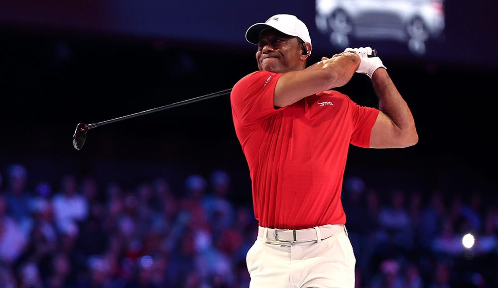 Tiger Woods takes his first full swing in more than a year in TGL match Tuesday (Adam Glanzman/TGL via Getty Images)
